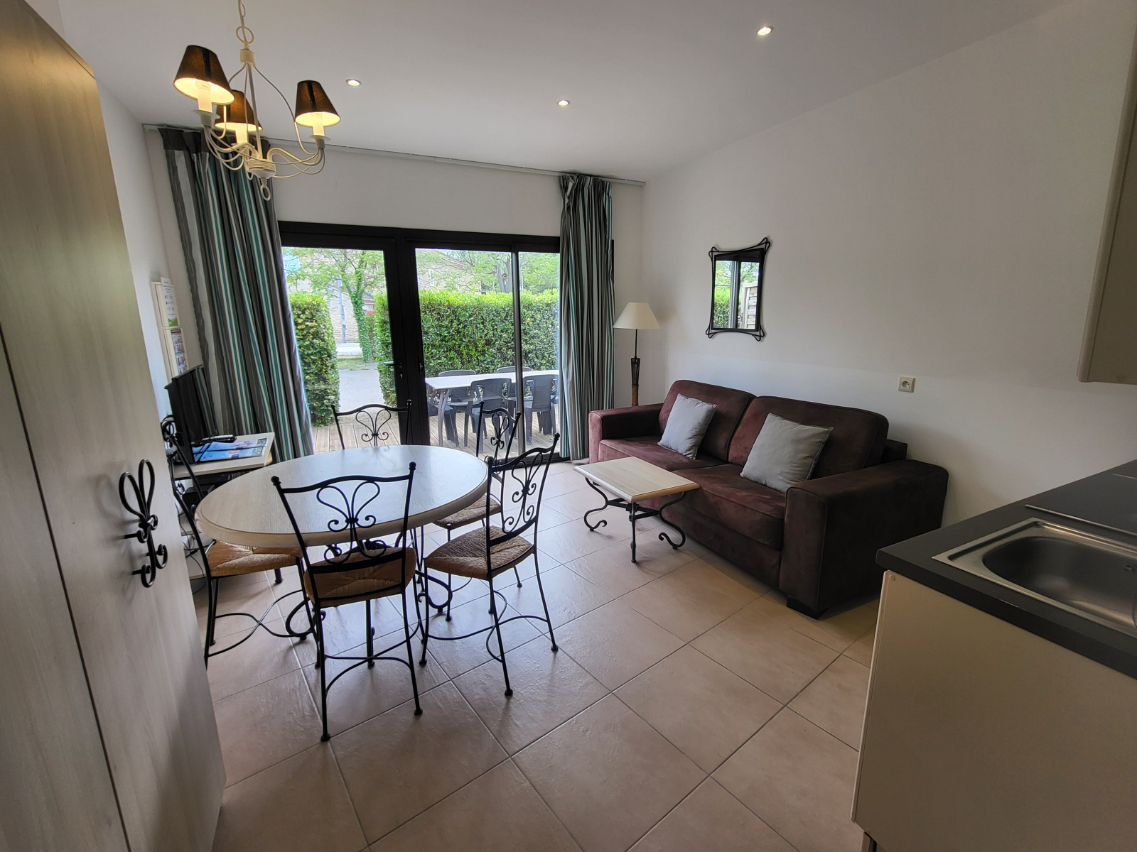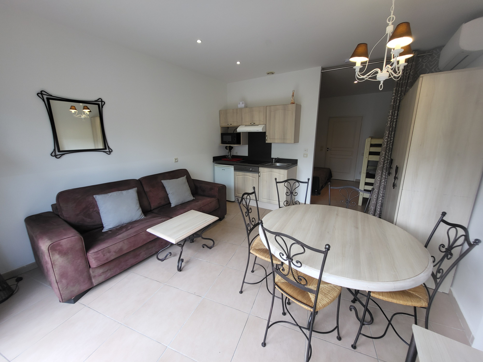 Appartement T2 bis meublé, situé en rez-de-jardin, d’une surface habitable d’environ 40 m². Il se compose d’une entrée, d’une salle de bains avec WC, d’une chambre équipée d’un lit double et d’un lit superposé, ainsi que d’une cuisine équipée ouverte sur le séjour avec canapé convertible et un accès à une terrasse exposée plein Sud.